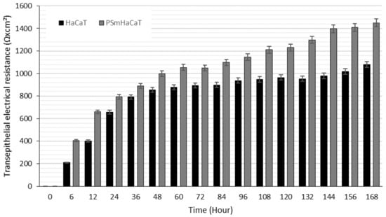 Proliferation tests were conducted on HaCaT cells seeded at 104/200 µL density using an xCELLigence Real-Time Cell Analyzer (RTCA). Figure 3 demonstrates the significant differences between the investigated samples. However, impedance-based determination of HaCaT cell proliferation demonstrated an obvious increase in the cell index in each of the cases, and the kinetics of the proliferation showed differences. Whereas the native HaCaT cells reached the confluent monolayer state after seven days, the IL-1β- and TNF-α-stimulated keratinocytes (PSmHaCaT) reached the plateau phase earlier after rapid proliferation. Moreover, PSmHaCaT keratinocytes demonstrated higher cell index values at this phase. To confirm this conclusion, classic transepithelial electrical resistance (TEER) measurements were also performed. The result of the transepithelial electrical resistance (TEER) measurements agreed with the RTCA tests. As shown in Figure 4, higher TEER values were observed in PSmHaCaT cells than in native keratinocytes at the same time.