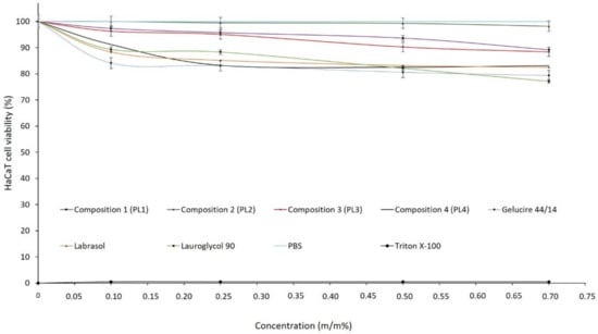 MTT cytotoxicity tests were performed on HaCaT cell monolayers to ensure safe application. The cytotoxicities of the formulated blends were evaluated in different concentrations. Each component of the compositions was also tested. Figure 5 shows that neither the formulated LC systems nor their components considerably affected the cell viability. The cell viability was less than 50% compared to that of the negative control (phosphate buffered saline (PBS)), even in a high concentration. We found that all compositions were tolerated well. There were no significant differences between LC- and PBS-treated (negative control) groups, although we concluded that composition II decreased cell viability the least.