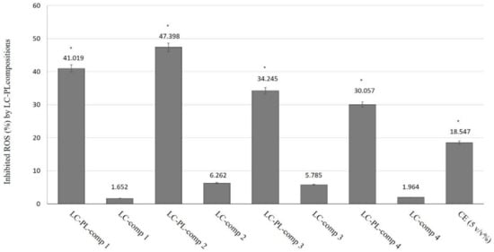 Inhibition of ROS (%) by different liquid crystal-Plantago Lanceolata extract (LC-PL) compositions. The positive control (CE) was water-dispersed P. lanceolata extract in 5% v/v concentration. The negative controls were the empty liquid crystal (LC) compositions. Values are expressed as means ± SD, n = 5. Significant differences between LC-PL-composition groups and the positive control group are marked with an asterisk (*).