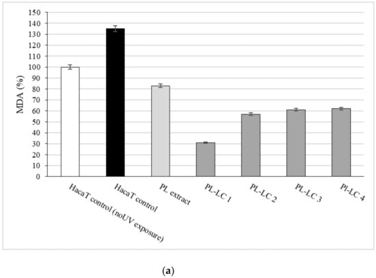 The protective effects of PL-LC compositions I–IV against UV irradiation were examined on HaCaT and PSmHaCaT cell lines. The results of the in vitro antioxidant activity measurements are presented in Figure 7. Evaluated MDA level differences confirmed not only the efficiency of PL extract as an antioxidant complex, but also the importance of the appropriate components of the formulation. Besides all PL-LC compositions being able to decrease MDA levels compared to the untreated and unformulated PL extract controls, we found that PL-LC composition I (with the highest penetration enhancer content) significantly decreased the MDA level.