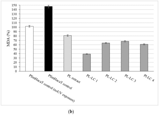 Effect of LC-PL-compositions on HaCaT (a) and PSmHaCaT (b) MDA levels after 6 min of UV exposure. The positive control PL extract was water. The negative controls were the untreated cells and UV-induced untreated cells. Values are expressed as means ± SD, n = 5. Significant differences between LC-PL-composition groups and the control group are marked with an asterisk.