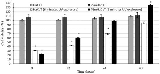 Cell viability evaluation with 3-(4,5-dimethylthiazol-2-yl)-2,5-diphenyltetrazolium bromide (MTT) assay on HaCaT and PSmHaCaT cells after 6 min of UV exposure and their recovery. Each data point represents the mean ± SD, n = 5. * means the data is significant since p value is 0.01 to 0.05.