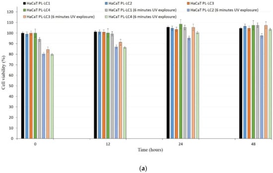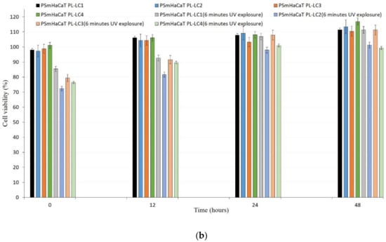 The UV protective effects of PL-LC compositions were investigated in HaCaT cells [35]. Cells were maintained under the described conditions. HaCaT and PSmHaCaT cells were seeded at the density of 104/200 µL on 96-well plastic plates. The test was performed on the 5th day of their proliferation (when the cells did not reach the total confluency state according to our RTCA measurements). The compositions were changed by replacing water with an equal volume of DMEM cell culture medium to avoid the harmful effect of the water. Each cell line was tested with and without the compositions by UV exposition performed by Oriel Sol-UV-4 UV Solar Simulator (Newport, Irvine, CA, USA). For the first experiment, we worked with the PL-LC formulations. In this experiment, we had two groups of HaCaT and PSmHaCaT cell lines. We applied the UV stimulus only to the second group. As a follow-up, all cell groups were tested directly after the exposure (or after the same six minutes later in case of control group), then 12, 24, and 48 h later via the MTT cell viability assay. In the second part of this experiment, cells were incubated with 0.5% v/v PL-LC compositions for 24 h (from their 4th day in proliferation), then exposed to UV-induced oxidative stress for 6 min. HaCaT cell viability was measured directly after the exposure by MTT assay. The follow-up investigation was carried out for 48 h, as in the previous case.