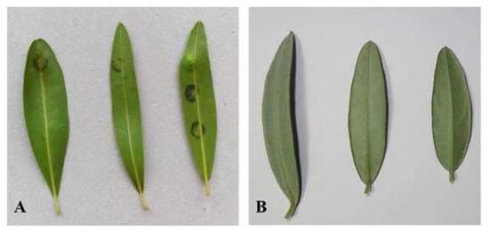 Olive leaf spot (OLS) lesions appeared on olive leaves after immersion in sodium hydroxide. (A) Leaves from control plants. (B) Leaves from laminarin-treated plants.