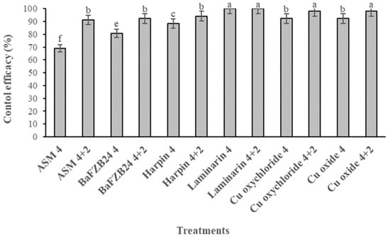 Control efficacy (%) of olive leaf spot achieved by several resistance-inducers, a biological control agent or copper fungicide treatments applied either in a single application 4 weeks before inoculation or in a dual application 4+2 weeks before the inoculation with Fusicladium oleagineum. Each value is the mean of three replicates ± standard error. Different letters on the columns indicate significant differences among treatments according to Tukey’s multiple range test at p = 0.05. Vertical lines indicate the standard error of the mean.