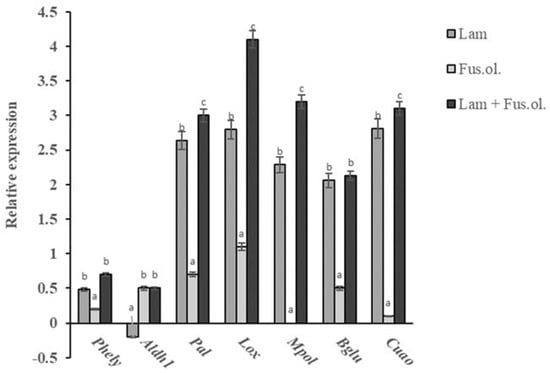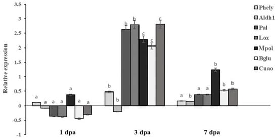 After completing the determination of the evaluated products’ efficacy against OLS, laminarin was found to be the most effective PRI. For this reason, the expressions of seven defense-related genes (alcohol dehydrogenase (Aldh1), phenylalanine ammonia-lyase (Phely), 9-Lipoxygenase (Lox), major pollen allergen (Mpol), Beta-1,3-glucanase (Bglu), copper amine oxidase (Cuao), phenylalanine ammonia-lyase (Pal)) in olive plants were investigated in laminarin-treated plants in comparison to plants treated with water. Samples were collected 1, 3 and 7 days post-application of laminarin (hereafter 1 dpa, 3 dpa and 7 dpa, respectively).