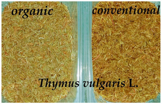 In the experiment over water macerates of herbs from organic and conventional cultivation, higher content of chlorophylls and carotenoids were determined in organic cultivation, which is opposite to Hallmann et al. [21]. Although Onofrei et al. pointed on a higher content of pigments presents in organically cultivated thyme and oregano [33]. It needs to be added that Hallmann et al. refer to lower content only of beta-carotene, and in the conducted experiment, the authors were determining the total carotenoids content [21]. Simultaneously Halmann et al. [21] pointed to the fact of a higher content of lutein and zeaxanthin (belonging to carotenoids) in organically cultivated herbs comparing to conventional one and in case of thyme major carotenoid is zeaxanthin [34].