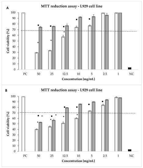 According to the ISO (International Organization for Standardization, 2009) norm 10993-5 (Biological evaluation of medical devices—Part 5: Tests for in vitro cytotoxicity), testing of cytotoxicity was performed using L929 mouse fibroblasts (LGC Standards, Middlesex, UK). The cells were maintained under standard conditions (37 °C, 5% CO2) in compelled culture medium (cRPMI-1640 medium supplemented with 10% fetal bovine serum (FBS) and antibiotics: 100 U/mL penicillin and 100 μg/mL streptomycin) Sigma-Aldrich (Darmstad, Germany) as previously described [57]. Before being used in the cytotoxicity assay, the cells’ viability was assessed by excluding trypan blue dye and was in the range of 93–95%.