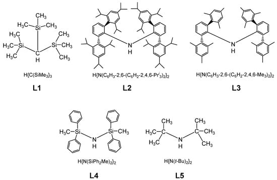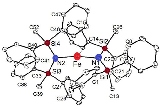 Molecular magnetism, which is the focus of current scientific interest with possible technological aspects, is mostly present in molecules with unusual geometry and bonding anisotropy [1,2,3,23], such as two-coordinate iron(II) complexes with linear geometry that possess interesting electrical and magnetic properties [24,25,26,27,28,29,30,31,32,33,34]. In order to create such an unusually low coordination number and stabilize low-valent metal centers, a special set of bulky, protective ligands was designed, as shown in Chart 1. These are sterically demanding methanide (L1) and amide (L2–L5) ligands, which become mono-anions upon deprotonation (Chart 1). Thus, complexes of FeL2 type were formed, and only one, FeII[C(SiMe3)3]2 (Fe(L1)2 later), represents a highly air and moisture sensitive organometallic compound [32], the structure of which is presented in Figure 3. The protective ligand is therefore trimethyl(trisilyl)methanide. Other FeL2 complexes (L = L2–L5) are formally low-coordination, number-unstable Werner-type complexes. In this structure, the iron atom forms a linear C-Fe-C array with a 180 °C-Fe-C angle. Three tri-methylated silicon atoms forming an excellent protective shield are bound to two carbon atoms connected to the metal center (Figure 3).