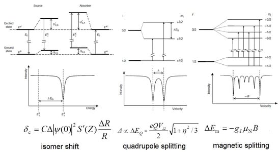 Energy level diagrams for hyperfine interactions at 3/2→1/2 nuclear spin transition and a schematic representation of the corresponding Mössbauer parameters in the spectrum. In the formulas, |Ψ(0)|2 is the s electronic density, R is the radius of the nucleus, S’(Z) is the Shirley factor, Q is the nuclear quadrupole moment, Vzz is the principal component of electric field gradient, η is the asymmetry parameter, gI is the nuclear gyromagnetic factor, μN is the nuclear magneton and B is the magnetic flux density.