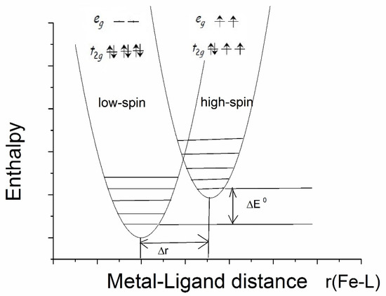 Spin transition may occur in transition metal complexes with an octahedral inner sphere of the central atom if the metal ion can acquire a low-spin (LS) state, as well as in high-spin (HS) states with a small enthalpy difference. The most commonly studied spin transition molecules are FeII compounds [21]. Spin transition can be initiated by changing the temperature, pressure, or visible light exposure. The schematic distribution of the electrons on the 3d shell of FeII in the low-spin and high-spin configurations and their associated enthalpy curves is shown in Figure 2, with vibrational levels indicated. At low temperatures, the low-enthalpy, low-spin state is more stable, but if the temperature exceeds a certain value, the high-spin electron structure will become the more thermodynamically stable state. Spin transition is a molecular phenomenon that depends on intermolecular interactions. The whole crystal lattice is involved in the process of the spin transition of the central iron ion. Mössbauer spectroscopy is well-positioned as a diagnostic method to determine spin transitions in iron complexes [21,22]. Since both FeII and FeIII are distinguishable by Mössbauer measurements, different isomer shift and quadrupole splitting values are characteristic for low- and high-spin compounds. Namely, the lower isomer shift is characteristic of the LS states for both FeII and FeIII, while the quadrupole splitting was found to be lower in LS FeII compounds and higher in LS FeIII compounds as compared to the relevant HS states [21]. For example, the isomer shifts typical of LS FeII compounds are δ = −0.1 to 0.2 mm/s, the quadrupole splitting is Δ = 0.2 to 1.9 mm/s, and while the typical isomer shifts of HS FeII compounds are δ = 0.9 to 1.3 mm/s, the quadrupole splitting is in the range Δ = 2.0–2.7 mm/s at room temperature [16,19]. Notably, the Mössbauer parameter ranges usually do not overlap each other.