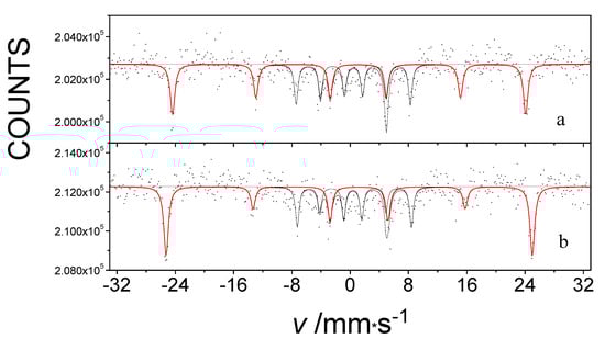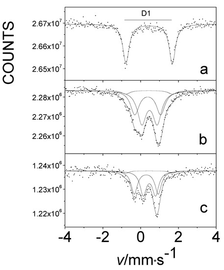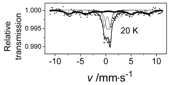 An analysis of spectra showed that the magnitude of the internal magnetic field remained unchanged when an external magnetic field was applied. This confirms the presence of an antiferromagnetic interaction in the studied system [43]. The antiferromagnetism of this sample was also verified by measurements of its magnetic susceptibility [43].