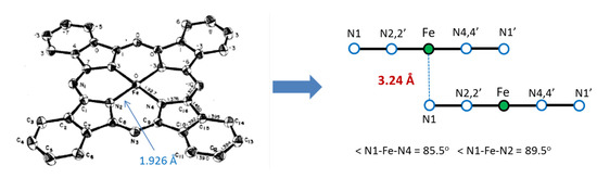 As a result of our collaboration with scientists from Drexel University (Philadelphia, PA, USA), we found a new method for the encapsulation of ferromagnetic iron carbides into carbon nanotubes by pyrolysis of the iron(II) phthalocyanines, FePc, in both the α-and β-forms [36]. This complex has a layered structure, with an FeII center in a square-planar environment with very short Fe-N(ring) bonds of 1.926 Å (Figure 9). The FePc units form a slipped π-stacked arrangement in the crystal where Fe is in very long Fe-N distance (3.24 A) from the N1 atom of an adjacent molecule [37].