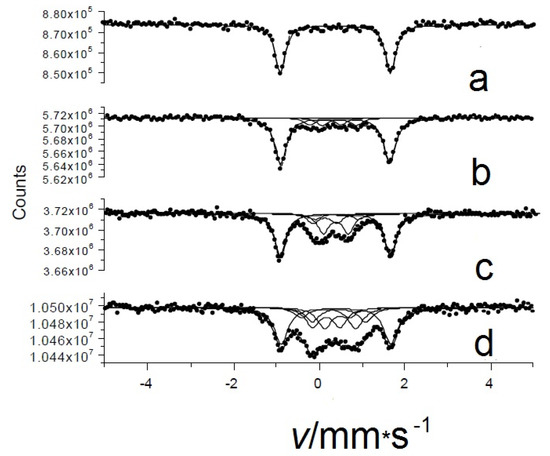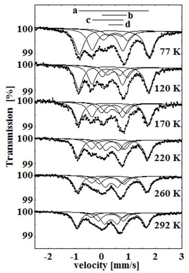 In our next study of the oxygenated β-iron(II) phthalocyanine, we observed the formation of an oxidized FeIII species, and we also found the temperature-dependent spin transition (SCO) for one of the FeIII components [40,41]. This process is illustrated in a series of overlaid spectra shown in Figure 11. When the temperature was raised from 77 to 292 K, the relative area of the low-spin component c decreased, and the area of the high-spin component d increased.