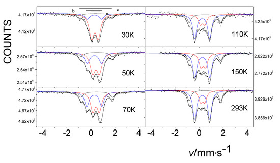 Temperature dependence of the Mössbauer spectra of β-iron phthalocyanines loaded with oxygen in an O2/H2O stream at 50 °C for 75 days. As the temperature increases, a transition is observed between the low-spin component b and the high-spin component c.