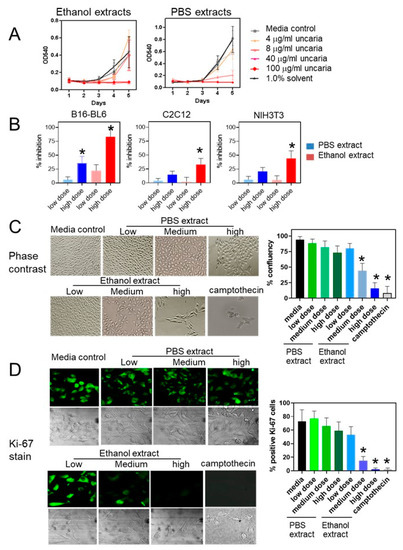 Inhibition of B16- BL6 cell proliferation treated with Uncaria tomentosa extracts: (A) B16-BL6 melanoma cells were treated with Uncaria tomentosa extracted with 70% ethanol or PBS at 4, 40, or 100 μg/mL on day one of treatment and relative cell viability determined every day over a period of 4 days using an MTT assay; (B) the relative viability of B16-BL6, NIH3T3, and C2C12 cells was determined for cells treated with Uncaria tomentosa extracts for 4 days using an MTT assay and the percent inhibition of cell viability was determined compared to media controls; (C) phase contrast micrographs of cell cultures treated with Uncaria extracts for 3 days showing changes in cell confluency as presented in the bar graph; and (D) fluorescence microscopic images of Ki-67-stained B16-BL6 cells and phase contrast images were taken on day 3 of treatment with Uncaria tomentosa extracts and plotted as the % of cells that were positive for KI-67 staining. Data were analyzed for three independent experiments and differences from control were considered significant (*) when p ≤ 0.05 by a Tukey post hoc test.