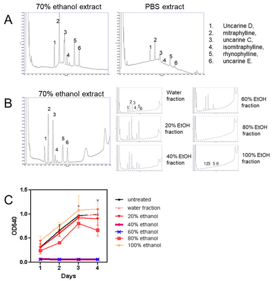The Uncaria tomentosa extracts were fractionated into different ethanolic fractions, as described in the Materials and Methods Section, in order to enrich for the potential active molecules and then test for their effect on the proliferation of B16-BL6 cells. HPLC showed that the level of the various oxindole alkaloids varied in each of the fractions with the highest levels, in particular uncarine D, mitraphylline, and uncarine C, in the 40 and 60% ethanol fractions (Figure 2B). The treatment of the B16-BL6 cell line with 1 µg/mL of each reconstituted fraction in culture media showed a significant decrease in cell viability for the 40 and 60% fractions using an 3-(4,5-dimethylthiazol-2-yl)-2,5-diphenyltetrazolium bromide (MTT) assay over 1 to 4 days in the continued presence of the extract (Figure 2C).