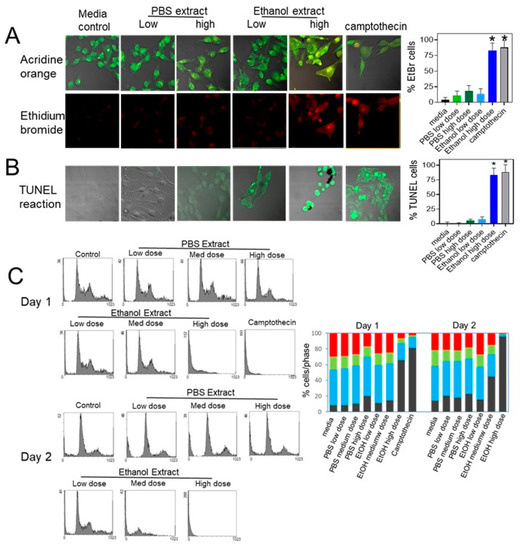 Since B16-BL6 cells treated with Uncaria tomentosa extracts showed a significant decline in viability, the effects of Uncaria extracts on cell death and apoptosis were examined. B16-BL6 cells treated with the high (100 µg/mL) dose of the ethanol extract of Uncaria tomentosa for 3 days showed changes in cell and nuclear morphology consistent with apoptosis using the fluorescence microscopy of cells stained with acridine orange and ethidium bromide (Figure 3A). Cells treated with the PBS extract or with the low dose of the ethanol extract showed a similar shape and size compared to media-treated controls. This corresponded to ethidium bromide staining of <20% of cells treated with the PBS extracts but 77 ± 11% of the cells treated with the highest dose of Uncaria tomentosa stained with ethidium bromide corresponding to an increase in late apoptotic morphology which was similar to Camptothecin-treated cells.