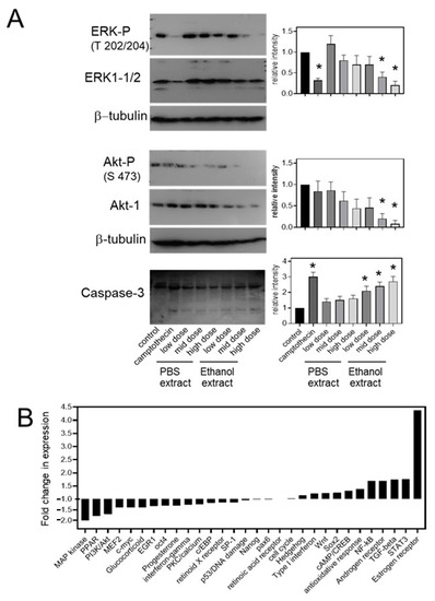 Treatment with Uncaria tomentosa inhibits ERK and Akt phosphorylation and promotes caspase cleavage in B16-BL6 cells: (A) B16-BL6 cells were treated with ethanol or PBS extracts of Uncaria tomentosa or 10−6 M Camptothecin for 48 h and cell lysates were collected and subjected to immunoblot analysis using ERK (threonine 202/204) phosphate, ERK1/2, Akt (serine 473) phosphate, Akt, β-tubulin, and caspase-3 antibodies. The relative intensities of the phosphorylated bands, normalized for the level of total protein or the relative level of cleaved/uncleaved forms, were determined by densitometry and the fold change for 3 independent experiments, as shown in the bar graphs. Differences compared to the control were considered significant (*) when p ≤ 0.05 by a Tukey post hoc test; (B) the relative activity of the indicated transcription factor pathways for B16-BL6 cells treated with 100 µg/mL of the ethanol extract of Uncaria tomentosa for 24 h was determined using the Cignal transcriptional profile assay. The relative luminescence was corrected for a constitutive control plasmid and fold changes between the Uncaria- and vehicle only-treated controls are reported for two experiments.