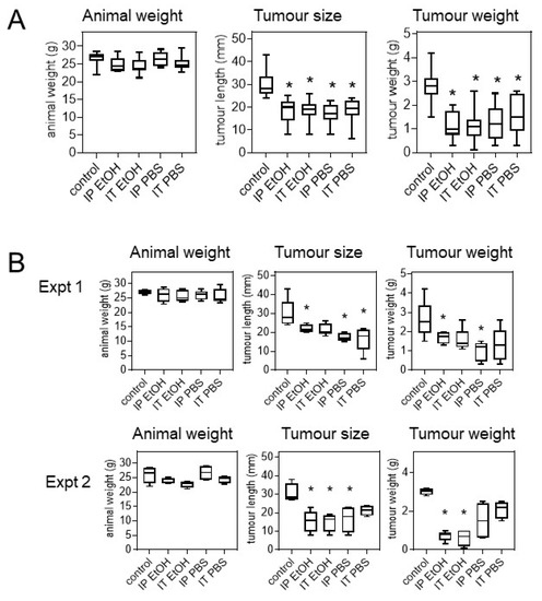 Tumour weight was evaluated following treatment with Uncaria tomentosa. Animals were injected with B16-BL6 tumour cells and then received intraperitoneal (IP) or intra-tumour (IT) injections with Uncaria tomentosa, extracted with 70% ethanol (EtOH) or PBS, pH 7.4, (PBS) that had been freeze-dried and resuspended in PBS. At endpoint, the mice were euthanised and the tumours were removed to determine the tumour diameters (size) and weights, and the mouse body weights. The average measures for each of the five treatment groups was plotted using a box and whisker plot (whiskers are 95% interval) for the (A) combined experiments (n = 8–10) or (B) two separate experiments (n = 4–5). The results revealed that there were significant differences (p < 0.05) between each of the four treated groups compared to the control (*) using ANOVA and Tukey post hoc statistical analysis.