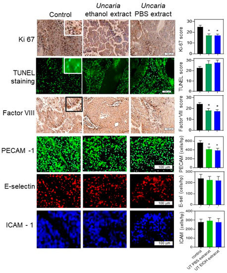 Histochemical analysis of cell viability and endothelial cell markers in sections of B16-BL6 tumours isolated from mice treated with Uncaria tomentosa extracts. Histochemical analysis was performed on B16-BL6 tumour tissue from mice treated with the vehicle, the resuspended ethanol extract, or the resuspended PBS extract of Uncaria tomentosa and typical microscopic fields shown. Sections were stained with the anti-Ki67 antibody, TUNEL reagent, or anti-Factor VIII antibody and the relative intensity of staining was determined from 8 images/tumour on an ordinal scale (0–5) directly from microscopic images. Inserts in the control images show higher magnification images of stained cells. A tissue section was triple-stained with fluorescence-labelled antibodies against the endothelial cell markers PECAM-1, E-selectin, and ICAM-1. The number of labelled cells was counted for each high-power field (hpf) from 8 different fields and the mean and standard deviation determined for each condition is shown in the bar graphs. One-way ANOVA and post hoc Tukey tests were performed to reveal any significant differences (*) in staining levels between tumours treated with Uncaria tomentosa extracts and vehicle only control tumours (p < 0.05).