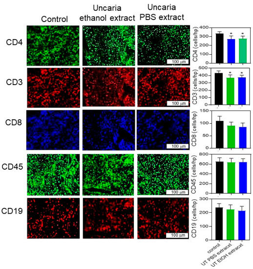 Histochemical analysis of infiltrating immune cells in sections of B16-BL6 tumours isolated from mice treated with Uncaria tomentosa extracts. Histochemical analysis was performed on B16-BL6 tumour tissue from mice treated with vehicle, the resuspended ethanol extract, or the resuspended PBS extract of Uncaria tomentosa and typical microscopic fields shown. Tissue sections were stained with fluorescence-labelled antibodies against T-cell markers including CD4 (T helper cells), CD3 (pan T cells), and CD8 (cytotoxic T cells), and leukocyte markers including CD45 (pan leukocytes) and CD19 (B cells). The number of labelled cells/hpf was counted from 8 different fields and the mean and standard deviation determined for each condition is shown in the bar graphs. One-way ANOVA and post hoc Tukey analysis were performed to reveal any significant differences (*) in the number of cells between conditions (p < 0.05).