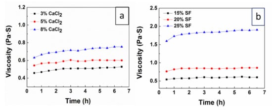 The viscosity changes of different silk fibroin (SF)/CaCl2/formic acid (FA) solutions (a) the content of CaCl2 in CaCl2/FA solvent was 3, 5, and 8 (w/v) %, respectively, when SF concentration was 15 (w/v) %. (b) The concentration of SF was 15, 20, and 25 (w/v) %, respectively, when the content of CaCl2 was 5 (w/v) %.