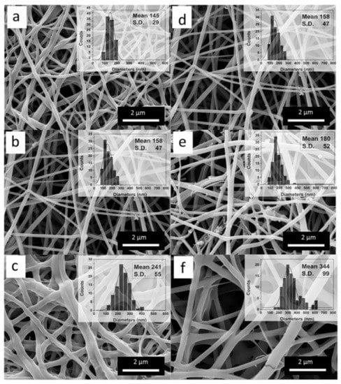 The morphology of the electrospun SF nanofibers was observed by SEM, as shown in Figure 2. The surface of the electrospun fibers was relatively smooth. With the increase of CaCl2 concentration from 3 (w/v) % to 8 (w/v) % when SF concentration was 15 (w/v) %, the average diameter of SF fibers increased from 145 ± 29 nm to 241 ± 55 nm (Figure 2a–c. On the other hand, with the increase of SF concentration from 15 (w/v) % to 25 (w/v) % when CaCl2 concentration was 5 (w/v) %, the average diameter of SF fibers increased from 158 ± 47 nm to 344 ± 99 nm (Figure 2d–f). These results indicated that with the increase of the viscosity of spinning dopes, the diameters of the fibers increased. In other words, the diameters of the fibers were closely related to the amount of silk nanofibrils and the proteins aggregation state in the spinning dopes. By adjusting the concentration of CaCl2 and SF in the spinning dopes, the diameters of the fiber templates could be easily regulated.