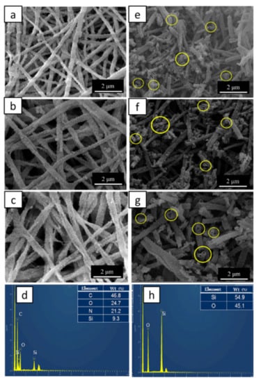 SF electrospinning fibers contain a large number of –OH, –NH2, and –COOH on their surface, and the presence of Ca2+ in the fibers make the surface of the fiber have good hydrophilicity, which provides a great possibility for inducing hydrolysis tetraethoxysilane (TEOS) to condense on its surface [33,36,37]. By soaking SF fiber templates in Söber-type sol-gel solution, the silica shell was successfully formed on the surface of SF fibers without adding any surfactant or coupling agent. After calcination, the hollow-structured mesoporous silicon nanotubes (MSNTs) could be obtained by removing the SF fiber templates from silica-coated SF nanofibers (SF@silica NFs). Figure 3 shows SEM images and EDS spectrum of SF@silica NFs before and after calcination, the SF@silica NFs prepared from the SF fiber templates with the concentration of CaCl2 at 3, 5, and 8 (w/v) % when SF concentration was 15 (w/v) %, respectively. It can be seen that the coating effect on the surface of the fiber templates was basically the same although the diameters of the fiber templates were different (Figure 3a–c). After calcination (Figure 3e–g), the MSNTs retained the form of the templates, the silica particles on the surface were closely arranged and evenly distributed, and the cross-section of MSNTs were in good shape without collapse or break. Figure 3d,h show the EDS spectrum of SF@silica NFs and MSNTs. Before calcination (Figure 3d), there were Si elements in SF@silica NFs in addition to C, O, and N elements of SF fibers, which demonstrated that the surface of the SF fibers was coated with silica particles. After calcination (Figure 3h), there were only Si and O elements remaining in the chemical composition of the MSNTs, and the mass fraction of Si elements was greatly increased compared with that before calcination, which indicates the basic removal of SF templates.