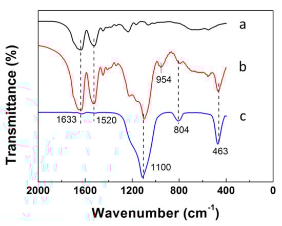 Figure 4 shows FTIR spectra of SF fiber templates, SF@silica NFs, and MSNTs. The FTIR spectra of SF fiber templates after treated with methanol (Figure 4a) exhibited the peaks at 1633 cm−1 and 1520 cm−1, corresponding to the amides I and amide Ⅱ characteristic peaks of β-sheet structures in SF fibers [38,39]. Besides the characteristic peaks of SF fibers, the FTIR spectra of SF@silica NFs (Figure 4b) exhibited all the characteristic peaks of silica. The peak at 1100 cm−1 assigned to the antisymmetric stretching vibration of Si-O-Si. Positions of 804 and 463 cm−1 were assigned to the symmetric stretching vibration and the bending vibration of Si-O, respectively, meanwhile, the peak at 954 cm−1 corresponding to the bending vibration of Si-OH [16,40]. After calcination, the FTIR spectra of MSNTs only shows the characteristic peak of silica, the peaks at amides Ⅰ and amide Ⅱ of SF templates and the peak of Si–OH all disappeared, indicating that the SF templates were removed and the Si-O-Si was formed between the Si-OH by removing the water molecules.