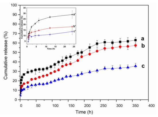 Cumulative release profiles of lysozyme from (a) lysozyme-loaded MSNTs-1, (b) lysozyme-loaded MSNTs-2, (c) lysozyme-loaded MSNTs-3. The insets (a’–c’) correspond to the cumulative release profiles of (a–c) in the first 24 h, respectively.