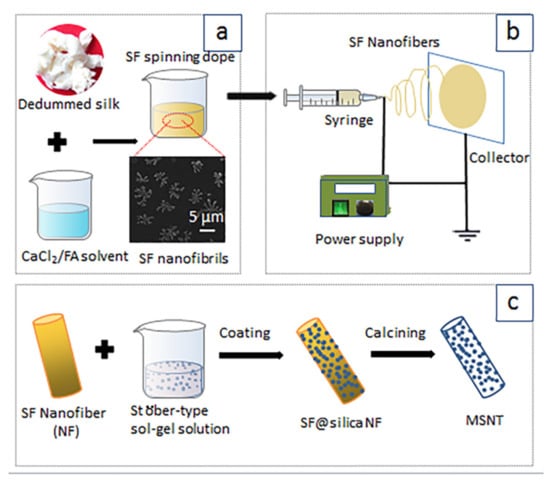 Schematic of fabrication MSNT (a) preparation of SF spinning dope, (b) electrospinning for SF nanofiber templates, (c) coating of SF nanofiber templates, and calcing of SF@silica NF.