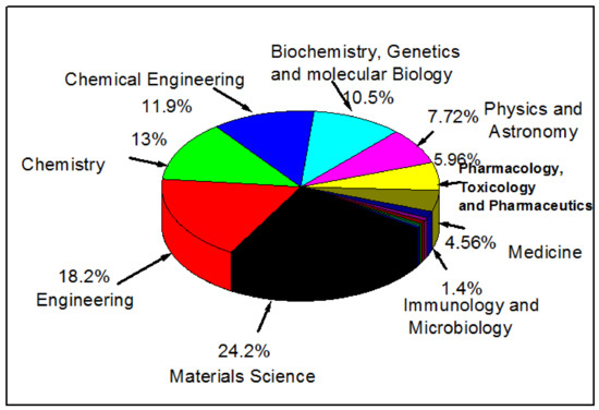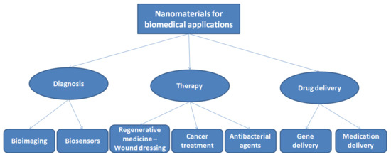 The above consideration is supported by the following analysis that we have carried out using data from Scopus for published articles dealing with the design of nanomaterials. This analysis has demonstrated a low percentage (about 12.5%) of publications relating to the applications of nanotechnology specifically in biomedical and biological engineering areas (Figure 1) as compared to other fields. Therefore, the current review article is aimed at supplementing this small body of work as well as filling the gap of a lack of analysis on recent trends and advances in nanotechnology for biomedical applications, including, but not limited to, tissue regeneration, medication delivery and wound healing. It should be noted that this review only covers non-biological materials for biomedical applications. To focus the discussion in the paper, we do not consider semimetals (or metalloids) and lanthanides that are used for medical applications sometimes.
