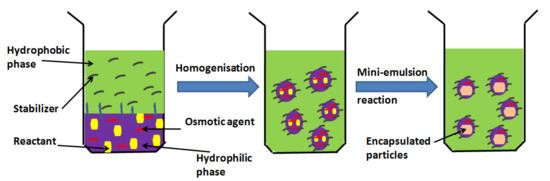 A schematic of a mini-emulsion process used for the preparation of encapsulated nanospheres (adapted from [13]).