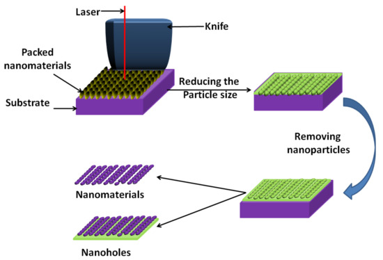 Nanosphere lithography (NSL) is also a common technique that is used for the preparation of nanosphere depositions on colloidal crystals. These facilitate the fabrication of various nanostructures on planar and non-planar substrates with low-cost, high-through put processing, a large fabrication area and a broad choice of materials. This strategy combines the benefits of both top-down and bottom-up methodologies. The procedure is divided into two stages. The first is to use ready-made, well-backed nanospheres of silica or latex as a substrate for the lithography process. The second stage includes substrates covered with a suspension containing monodisperse colloids (e.g., polystyrene) after a compound treatment to improve their hydrophilic character. After drying, a hexagonal close-pressed (HCP) monolayer or bilayer, called a colloidal crystal mask [14] (CCM), is framed, and this mask is then used to design new nanospheres (Figure 3). The subsequent removal of the mask (lift-off) by sonication in an adequate solvent or by stripping leaves an array of ordered nanodots on the surface of the substrate. An annealing step is sometimes necessary to crystallise the sample or/and induce a crystallographic phase change. Nanosphere lithography is otherwise called colloidal lithography or characteristic lithography [14,15].
