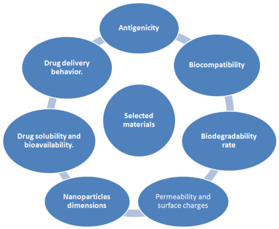 The decision of selecting a reasonable procedure for the formation of NPs depends upon the physicochemical characteristics of both the polymer and the drug to be used. NPs can be designed from a variety of materials, including proteins, polysaccharides and manufactured polymers. The choice of grid materials is also subject to numerous elements that are summarised in Figure 7 [73].