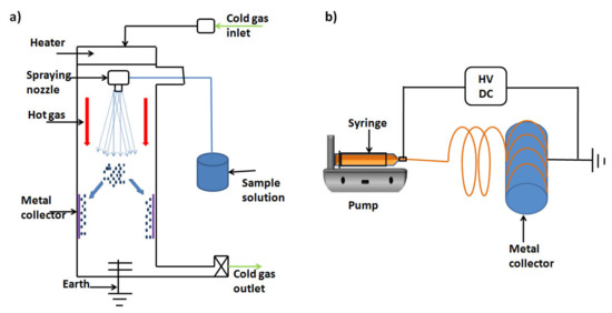 Schematic diagrams of (a) spray dryer and (b) electrospinner.