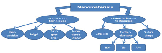 The particle size distribution, diameter and shape are very necessary parameters to evaluate the designed NPs and can be determined by several characterisation techniques. These techniques include a zetasizer, scanning electron microscopy (SEM), transmission electron microscopy (TEM) and atomic force microscopy (AFM), especially for the particle diameter, shape and phase of dispersion. Common preparation and characterisation techniques are illustrated in Figure 9.