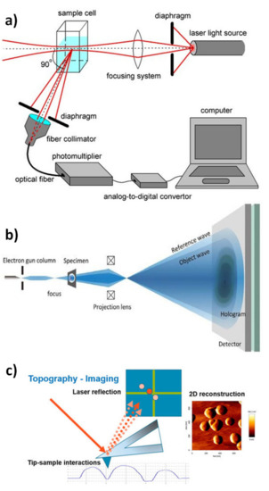 Schematic representations of (a) dynamic light scattering (DLS) [89], (b) transmission electron microscopy (TEM) [90] and (c) atomic force microscopy (AFM) [91].