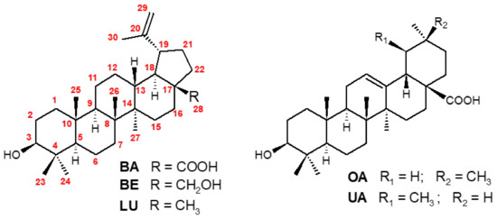Structures of betulinic acid (BA), betulin (BE), lupeol (LU), oleanolic (OA) and, ursolic (UA) acids.