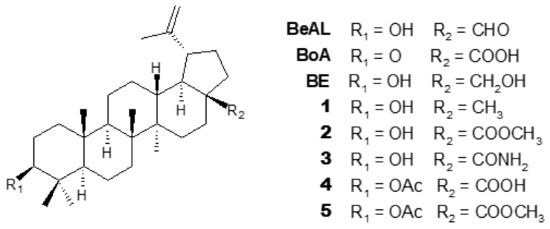 Later, in a screening study aiming to investigate the in vitro leishmanicidal activity of 46 scarce natural products, the weak antileishmanial effect of BA (IC50 = 87.5 µM) was then first evidenced against L. major promastigotes [59]. Similarly, betulinic acid acetate (4, IC50 = 44.9 µM) and BoA (IC50 = 51.2 µM) derivatives were also both weakly active against L. amazonensis [45].