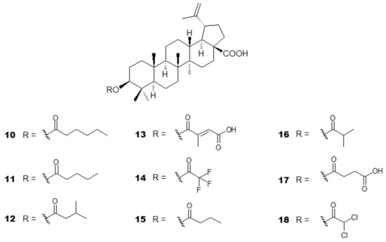 A new series of BA derivatives 10–18 obtained by carboxylic acid esterification at the C-3 OH group was synthesized in an attempt to improve the antimalarial properties of the BA skeleton. Among the nine derivatives prepared (Figure 4), two presenting smaller side chains (15 and 16, IC50 = 5–8 µM) were found to be two to three times more potent than BA (IC50 = 18 µM) against chloroquine-sensitive P. falciparum 3D7. Additionally, such analogues were non-cytotoxic towards the mammalian cell line HEK293T [53].