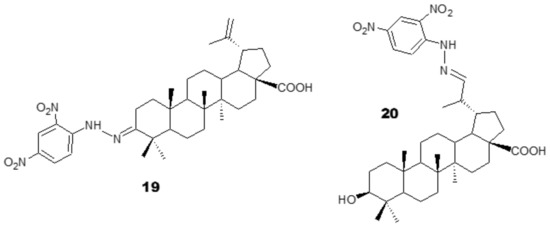 In a different chemical approach, nine 2,4-dinitrophenyl-hydrazono-BA analogues were prepared [55], but only compounds 19 (IC50 = 15.3 µM) and 20 (IC50 = 10.2 µM) (Figure 5) showed better antiplasmodial activity than BA (IC50 = 38.8 µM) against the chloroquine-resistant P. falciparum W2 strain.