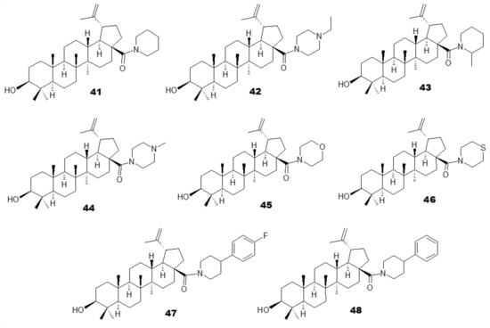 These findings indicated that BA could be considered a good lead for the design and synthesis of more potent and selective antitrypanosomal analogues [65]. Previous studies have suggested that changes at the C-28 carboxyl group could lead to analogues with enhanced antiprotozoal activities when compared to BA. Thus, new amide analogues 41–48 (Figure 6) were prepared and assayed against trypomastigotes forms of T. cruzi. The most potent antitrypanosomal effects were observed for 45 (IC50 = 1.8 µM; SI = 17.3), 46 (IC50 = 5.4 µM; SI = 5.3) and 48 (IC50 = 5.0 µM; SI = 10.7), while BA displayed an IC50 value of 19.5 µM and SI = 1. In this study, the authors identified 45 as a selective anti-T. cruzi agent, and additional experimental data showed this analogue destroys parasite cells by necrotic death and also exhibits synergistic activity when used in combination with benznidazole, the antiparasitic drug commonly employed in the treatment of Chagas disease [65].