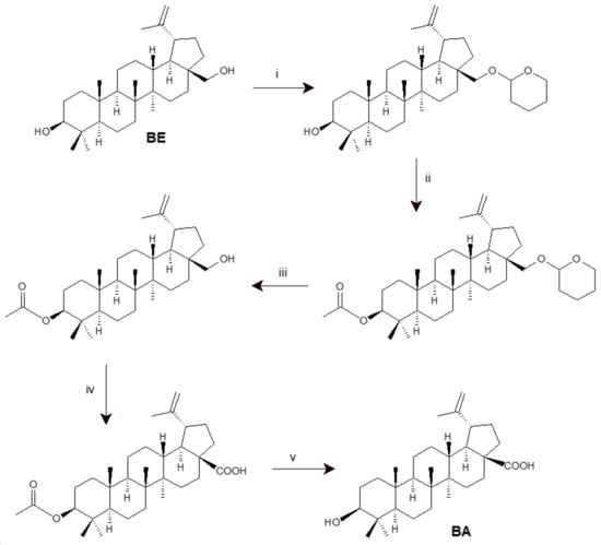 Synthesis of betulinic acid (BA) from betulin (BE) using protecting groups [38]. Reagents and conditions: (i) DHP/CH2C12/PPTS (95%); (ii) Ac2O/pyridine (87%); (iii) EtOH/PPTS (95%); (iv) CrO3/H2SO4/acetone (80%); (v) K2CO3/MeOH/H2O (88%).