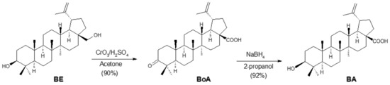 However, the most common methodology employed to synthesize BA from BE involves a direct Jones oxidation step (CrO3/H2SO4/acetone) to form first the intermediate betulonic acid (BoA), with a yield of 90%. Then, BoA is reduced with NaBH4/2-propanol to obtain, after recrystallization in hot methanol, pure BA. This way, a 3β-isomer yield of 92% is obtained (Scheme 2) [42].