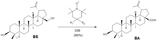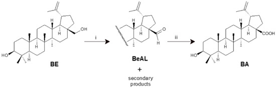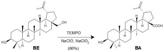 Currently, commercial production of BA substantially depends on traditional phytochemical extraction from birch bark [35], that yields around 0.025% w/w from dry material [38]. The structure related to BA, is the triterpene alcohol BE (Figure 1), which is much more abundant in birch trees (up to 34% of the dry barks) [39], but it is biologically less active [38,40] than BA. Therefore, BE could be employed as a starting material to easily prepare BA through semisynthesis, by oxidation of the primary hydroxyl group present at C-28.