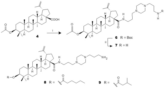 Synthesis of new piperazinyl derivatives of acetyl betulinic acid. Reagents and conditions: (i) ClCOCOCl, 0 °C, 3 h; TEA, N-tert-butoxycarbonyl-1,4-bis(3-aminopropyl)piperazine, RT, 24 h; (ii) TFA 10%/CH2Cl2, RT, 6 h.