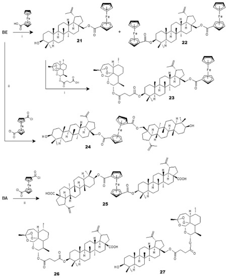Inspired by the highly active antimalarial compound ferroquine and by the previously prepared artemisinin–ferrocene hybrid, a series of BA/BE based dimer and hybrid compounds carrying ferrocene and/or artesunic acid moieties were designed and synthesized (Scheme 7), to include the ferrocene moiety into the new molecules as a linker or a subunit [56]. The antiplasmodial activity of all newly synthesized compounds 21–25 as well as the previously synthesized hybrids 26 and 27, were evaluated against P. falciparum 3D7 strain. Compounds 23 (IC50 = 1.49 µM), 26 (IC50 = 0.26 µM) and 27 (IC50 = 0.09 µM), which are hybrids of BA and artesunic acid, were found to be the most active antiplasmodial analogues.