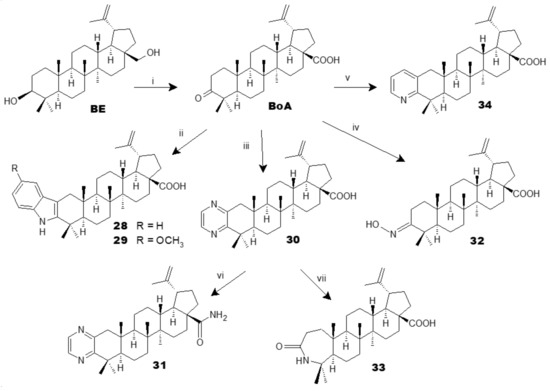 Heterocyclic analogues 28–34 were designed and synthesized from BE, employing BoA as a versatile intermediate. The employment of the cheap BE instead of BA is an advantage of this route. Different heterocycles were fused to the 2,3-position of the lupane skeleton, including isoxazole, pyrazine, pyridine, indole and pyrazole groups, while the carboxyl group at the C-28 position was also transformed into an amide derivative (Scheme 8). Among all compounds tested, the analogues 30 (IC50 = 13.2 µM) and 33 (IC50 = 4.3 µM) were found to display the best antileishmanial activity against axenic amastigotes of L. donovani, with derivative 33 being both the most potent and selective (SI = 12.9) antileishmanial analogue of all those reported in this study [60].